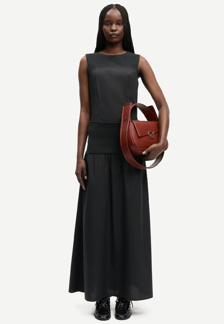 Den er lang og løs i A-form med normal pasform. Nederdelen har en elastisk ribstrikket talje i bomuldskvalitet. Skørtet er et fast materiale som falder let.